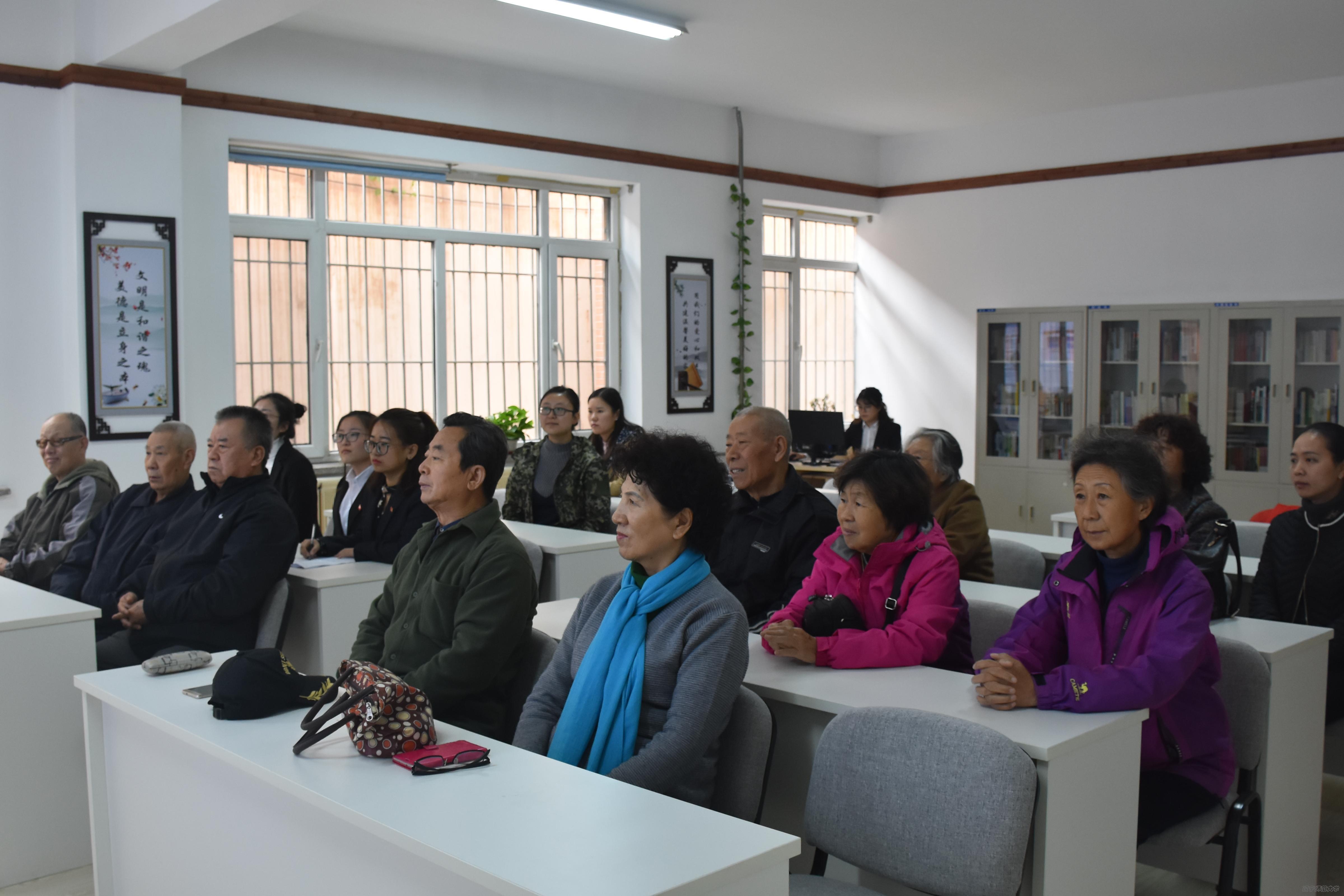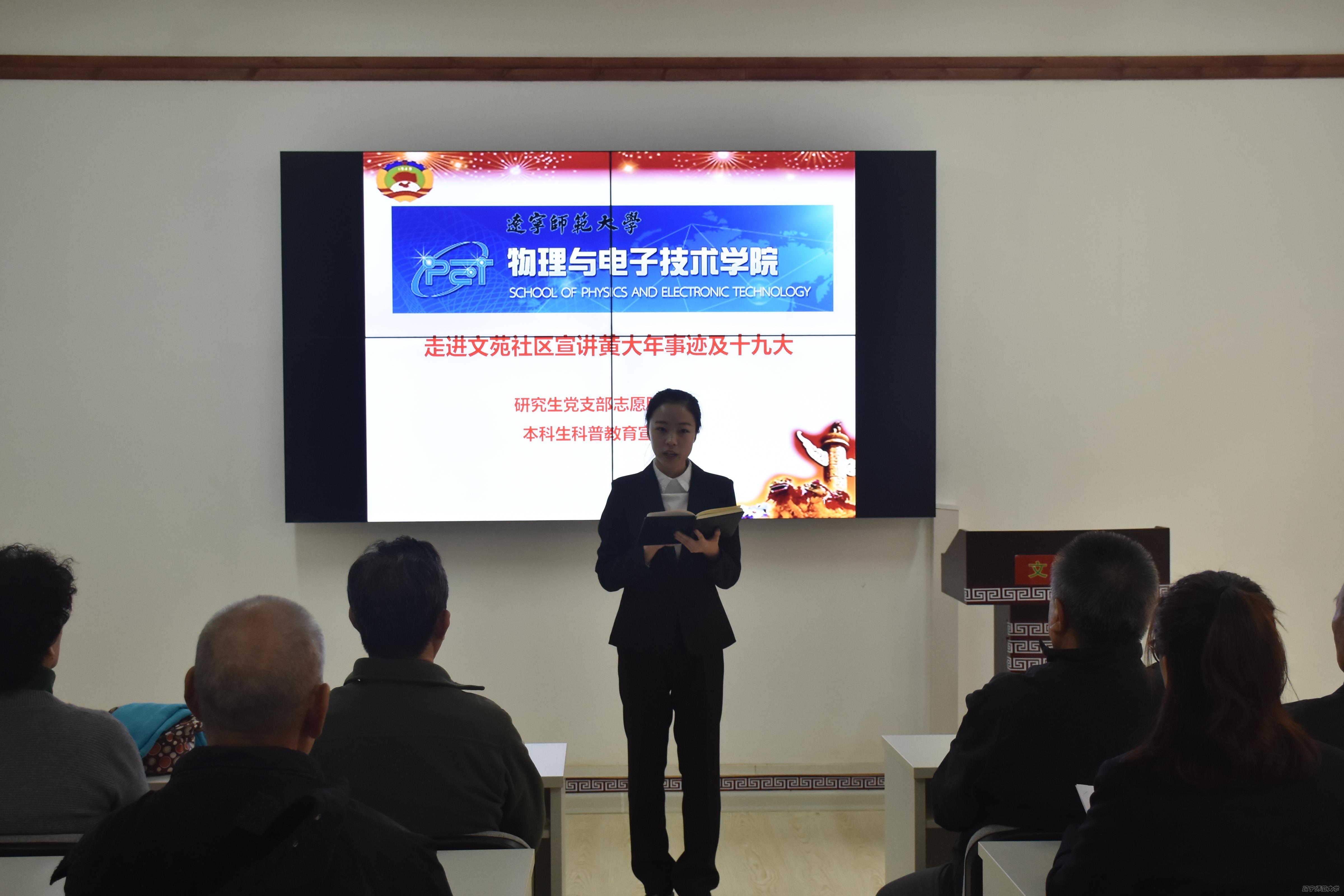 学生党员组成的本科生科普教育宣讲团和研究生志愿服务队于2017年11月10日上午在团委书记贾舒涵和组织员张廷娇的带领下走进大连市沙河口区马栏街道文苑社区,为退休老党员们进行了党的十九大精神和“全国优秀共产党员”黄大年同志先进事迹的宣讲活动。