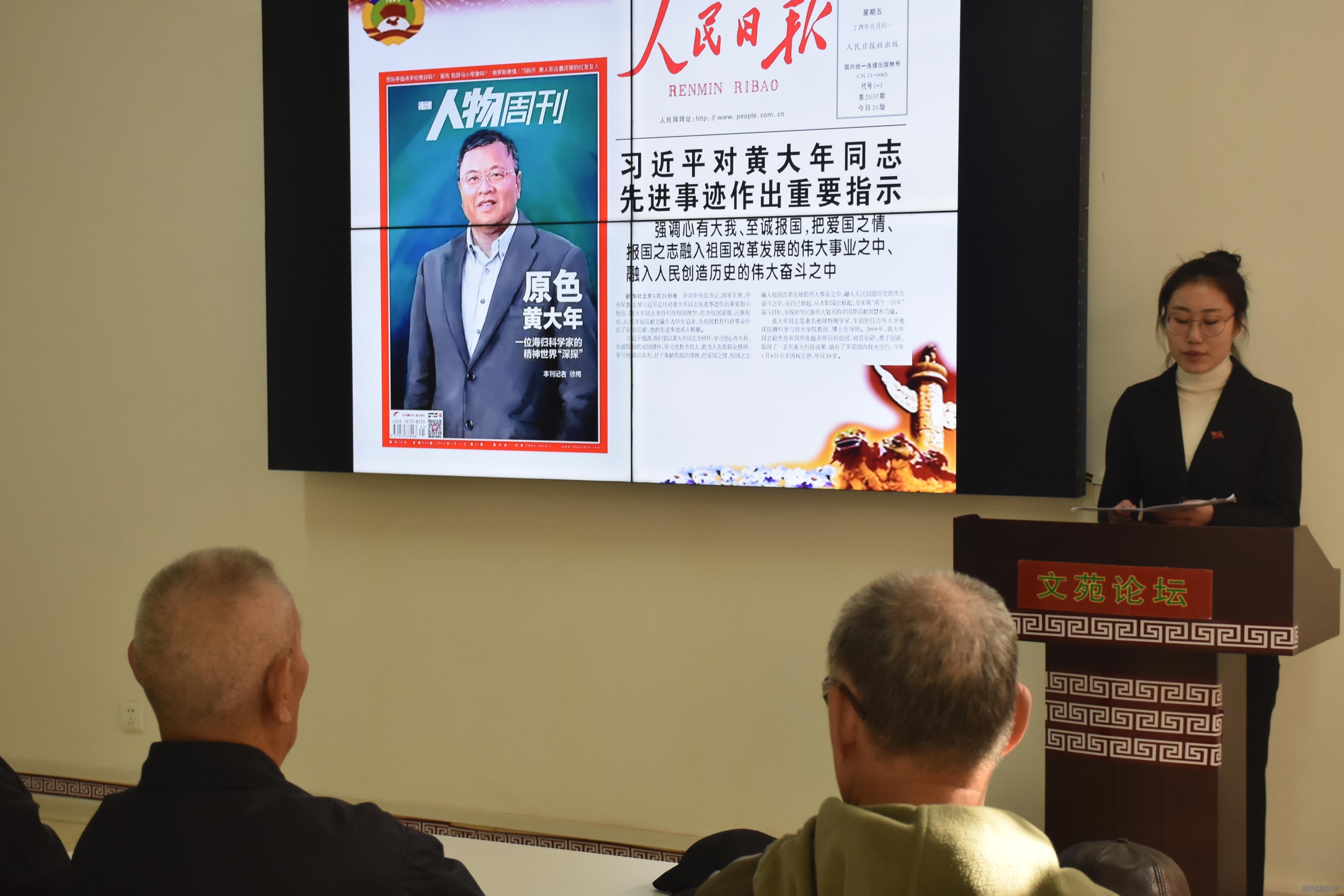 研究生党员牟博石和葛连珺通过回顾黄大年同志的生平向老党员宣讲了黄大年同志的先进事迹,黄大年同志至诚报国的爱国情怀和淡泊名利、甘于奉献的高尚情操深深感染了每一个共产党员,党员们纷纷表示要以黄大年同志为榜样,立足岗位,积极作为,做四讲四有合格党员,在自己平凡的工作岗位上再创佳绩。